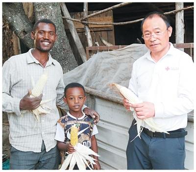 2025年11月26日,在埃塞俄比亚奥罗米亚州的戈迪诺村,中国援埃塞俄比亚第四期高级农业专家组副组长刘守云(右)与村民阿布·内加什(左一)展示新收获的玉米。