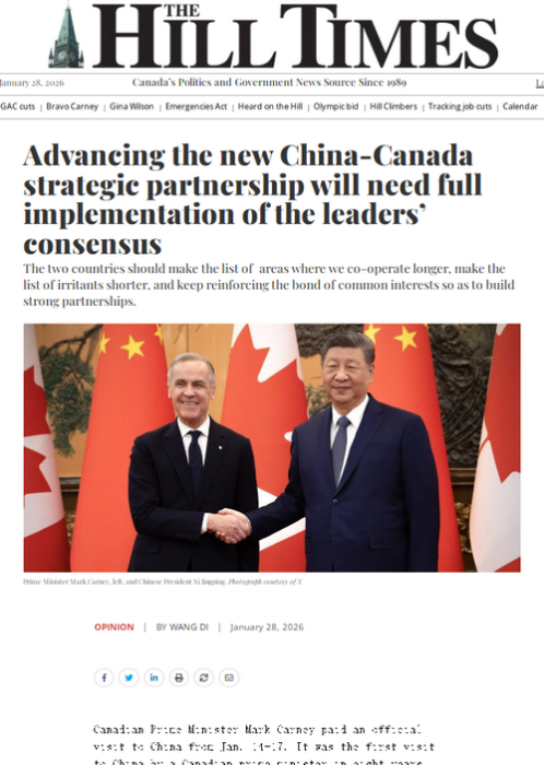 2026年1月28日,驻加拿大大使王镝在加主流媒体《国会山时报》发表署名文章《全面落实两国领导人重要共识 推进构建中加新型战略伙伴关系》。全文如下: