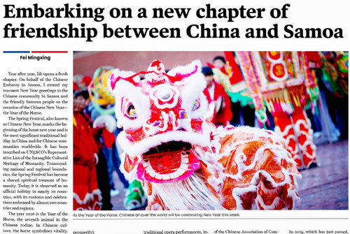 2026年2月13日,驻萨摩亚大使费明星在《萨摩亚观察家报》发表署名文章《开启中萨两国人民友好新篇章》,全文如下: