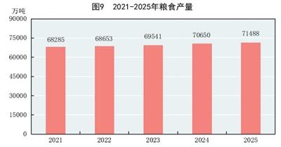 全年粮食产量71488万吨,比上年增加838万吨,增产1.2%。其中,夏粮产量14975万吨,减产0.1%;早稻产量2851万吨,增产1.2%;秋粮产量53662万吨,增产1.5%。谷物产量66021万吨,比上年增产1.2%。其中,稻谷产量20904万吨,增产0.7%;小麦产量14007万吨,基本持平;玉米产量30124万吨,增产2.1%。大豆产量2091万吨,比上年增产1.3%。(见图9)