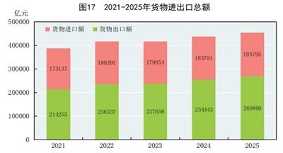 全年货物进出口总额454685亿元,比上年增长3.8%。其中,出口269890亿元,增长6.1%;进口184795亿元,增长0.5%。货物进出口顺差85094亿元。对共建“一带一路”国家进出口额236018亿元,比上年增长6.3%,占进出口总额比重为51.9%。其中,出口136851亿元,增长11.2%;进口99167亿元,增长0.1%。对《区域全面经济伙伴关系协定》(RCEP)其他成员国[52]进出口额138503亿元,比上年增长5.3%。民营企业进出口额260403亿元,比上年增长7.1%,占进出口总额比重为57.3%;其中出口176592亿元,增长7.2%。(见图17)(见表10)(见表11)(见表12)(见表13)
