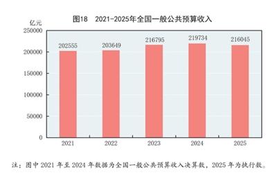 全年全国一般公共预算收入216045亿元,比上年下降1.7%;其中税收收入176363亿元,增长0.8%。全国一般公共预算支出287395亿元,比上年增长1.0%。全年现行支持科技创新和制造业发展的主要政策减税降费及退税金额28557亿元。(见图18)