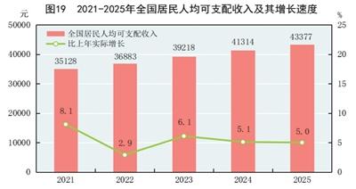 全年全国居民人均可支配收入43377元,比上年增长5.0%,扣除价格因素,实际增长5.0%。全国居民人均可支配收入中位数[63]36231元,增长4.4%。按常住地分,城镇居民人均可支配收入56502元,比上年增长4.3%,扣除价格因素,实际增长4.2%。城镇居民人均可支配收入中位数51115元,增长3.7%。农村居民人均可支配收入24456元,比上年增长5.8%,扣除价格因素,实际增长6.0%。农村居民人均可支配收入中位数20711元,增长5.6%。城乡居民人均可支配收入比值为2.31,比上年缩小0.03。按全国居民五等份收入分组[64],低收入组人均可支配收入10150元,中间偏下收入组人均可支配收入22702元,中间收入组人均可支配收入35536元,中间偏上收入组人均可支配收入55586元,高收入组人均可支配收入103778元。全国农民工人均月收入5075元,比上年增长2.3%。脱贫县[65]农村居民人均可支配收入18627元,比上年增长6.3%,扣除价格因素,实际增长6.5%。