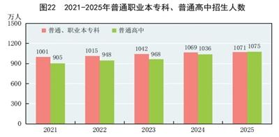 全年研究生教育招生143.8万人,在学研究生430.0万人,毕业生116.7万人。普通、职业本专科[74]招生1070.8万人,在校生3954.0万人,毕业生1105.1万人。中等职业教育[75]招生526.5万人,在校生1537.8万人,毕业生521.9万人。普通高中招生1074.9万人,在校生3039.5万人,毕业生924.6万人。初中招生1852.8万人,在校生5509.3万人,毕业生1723.7万人。小学招生1461.7万人,在校生10178.3万人,毕业生1860.5万人。特殊教育招生16.4万人,在校生92.7万人,毕业生18.4万人。学前教育在园幼儿3225.5万人。九年义务教育巩固率为96.1%,高中阶段毛入学率为92.0%。16—59岁人口平均受教育年限为11.3年,比上年提高0.1年。(见图22)