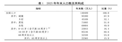 [6]2025年末,0—14岁(含不满15周岁)人口为21276万人,15—59岁(含不满60周岁)人口为86875万人。