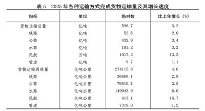 [31]货物运输总量及周转量包括铁路、公路、水路、民航和管道五种运输方式完成量,2025年增速按可比口径计算。
