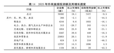 全年新设立外商投资企业70392家,比上年增长19.1%。实际使用外资金额7477亿元,下降9.5%。其中,共建“一带一路”国家(含通过部分自由港对华投资)对华新设立外商投资企业19756家,增长14.7%;对华直接投资1168亿元,增长1.9%。高技术产业实际使用外资2418亿元,下降15.6%。(见表14)