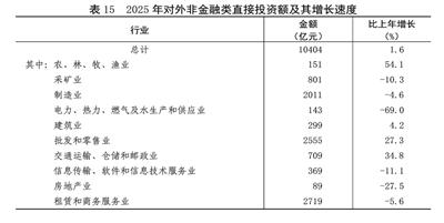 全年对外非金融类直接投资额10404亿元,比上年增长1.6%。其中,对共建“一带一路”国家非金融类直接投资额2834亿元,增长18.0%。(见表15)