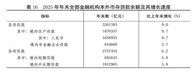 全年社会融资规模增量[54]35.6万亿元,按可比口径计算,比上年多3.3万亿元。年末社会融资规模存量[55]442.1万亿元,按可比口径计算,比上年末增长8.3%,其中对实体经济发放的人民币贷款余额268.4万亿元,增长6.3%。年末全部金融机构本外币各项存款余额336.1万亿元,比年初增加27.8万亿元,其中人民币各项存款余额328.6万亿元,增加26.4万亿元。全部金融机构本外币各项贷款余额275.7万亿元,增加16.2万亿元,其中人民币各项贷款余额271.9万亿元,增加16.3万亿元。人民币普惠小微贷款[56]余额36.6万亿元,增加3.6万亿元。本外币涉农贷款余额53.6万亿元,增加3.4万亿元;制造业中长期贷款余额14.9万亿元,增加1.0万亿元;绿色贷款余额44.8万亿元,增加7.7万亿元。全年全国新发放企业贷款加权平均利率[57]3.22%,比上年下降41个基点。(见表16)